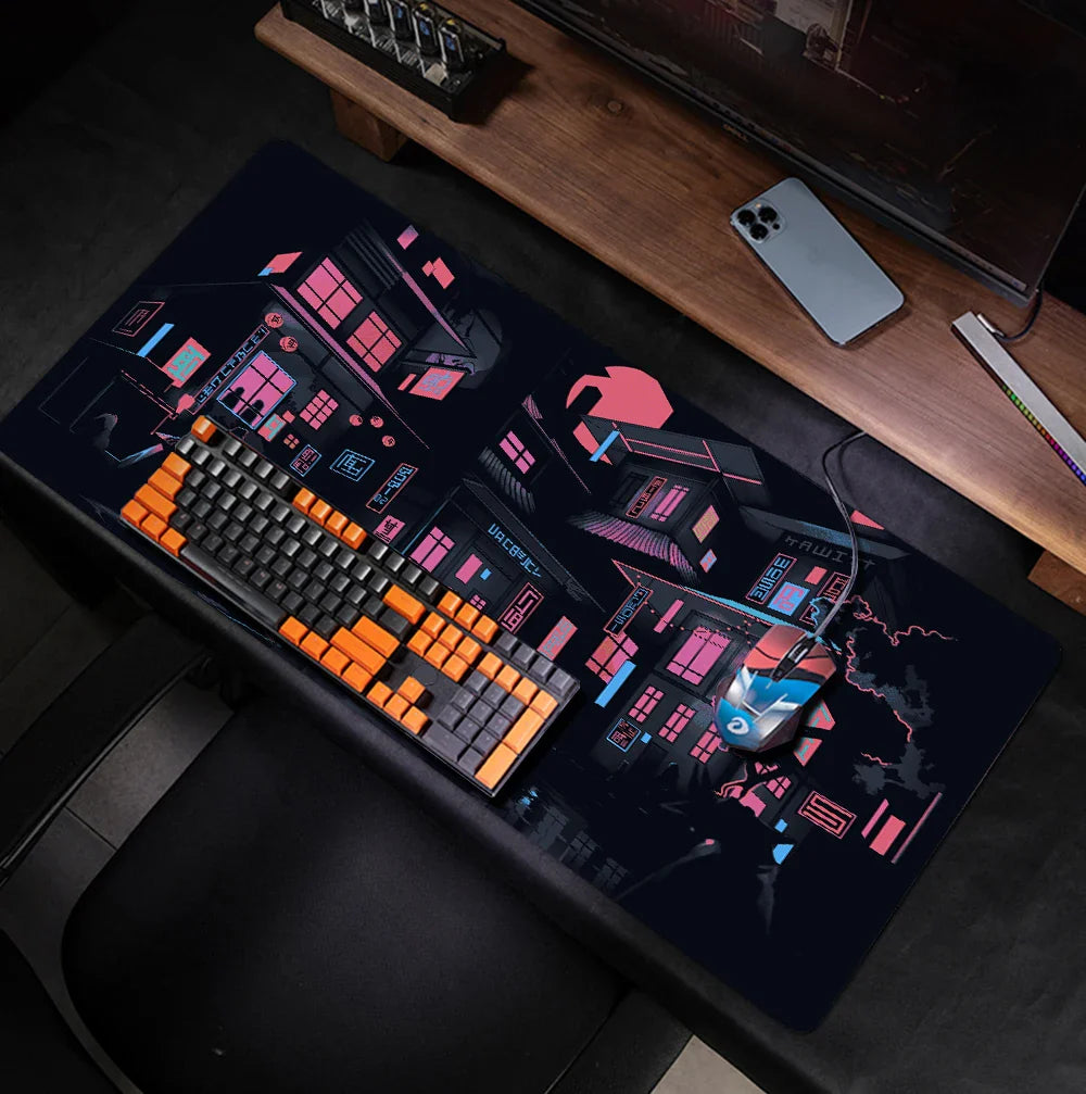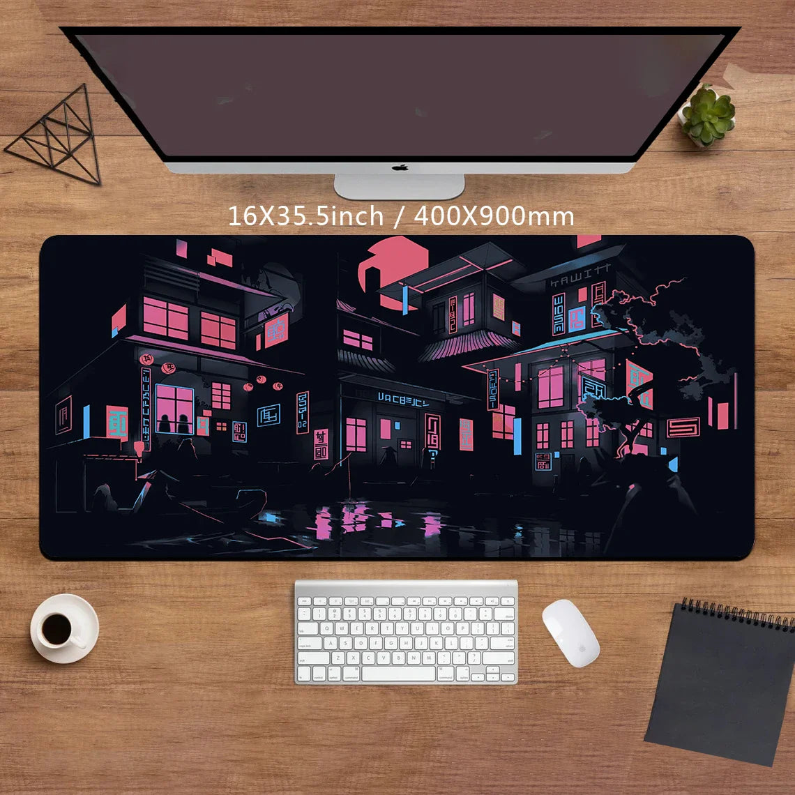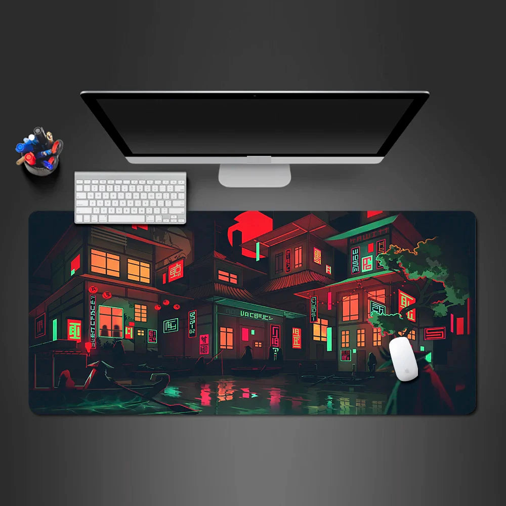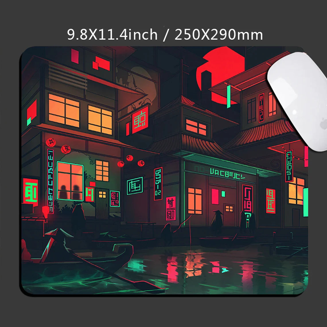 Experience the allure of Japan after dark with the Japanese Night Mouse Pad. This desk mat brings a slice of Japanese nightlife right to your workspace, complete with neon-lit buildings and reflective water puddles. The rubber and cloth construction offers a perfect balance of comfort and practicality for gamers and professionals alike.