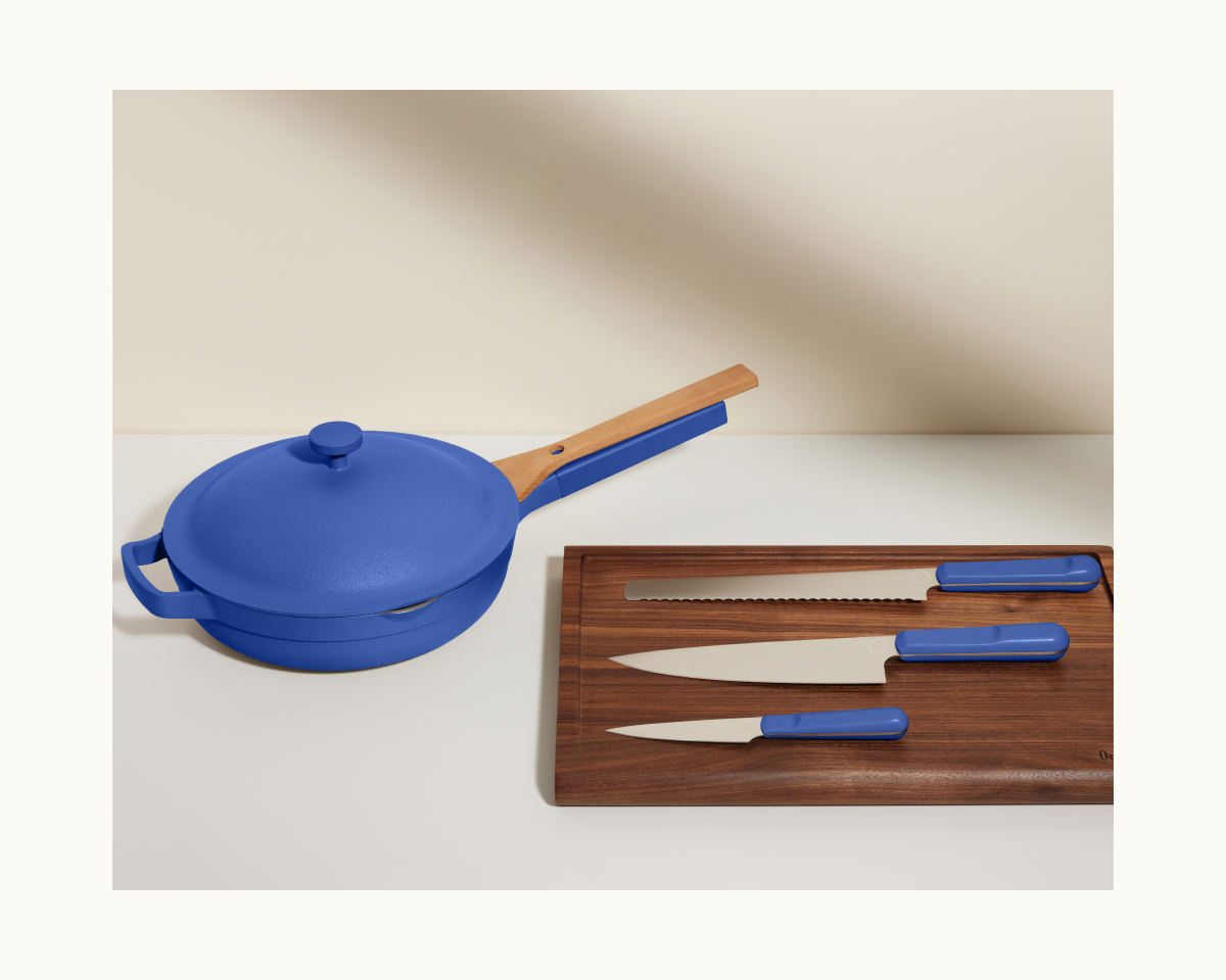 Cover all your slicing needs with just three knives. This trio includes our Everyday Chef’s Knife for sturdy chopping and all-the-time use, our Serrated Slicing Knife for anything soft and squishy or hard and crusty, and our Precise Paring Knife for those tinier (but very important) tasks. You’re all set to prep!
